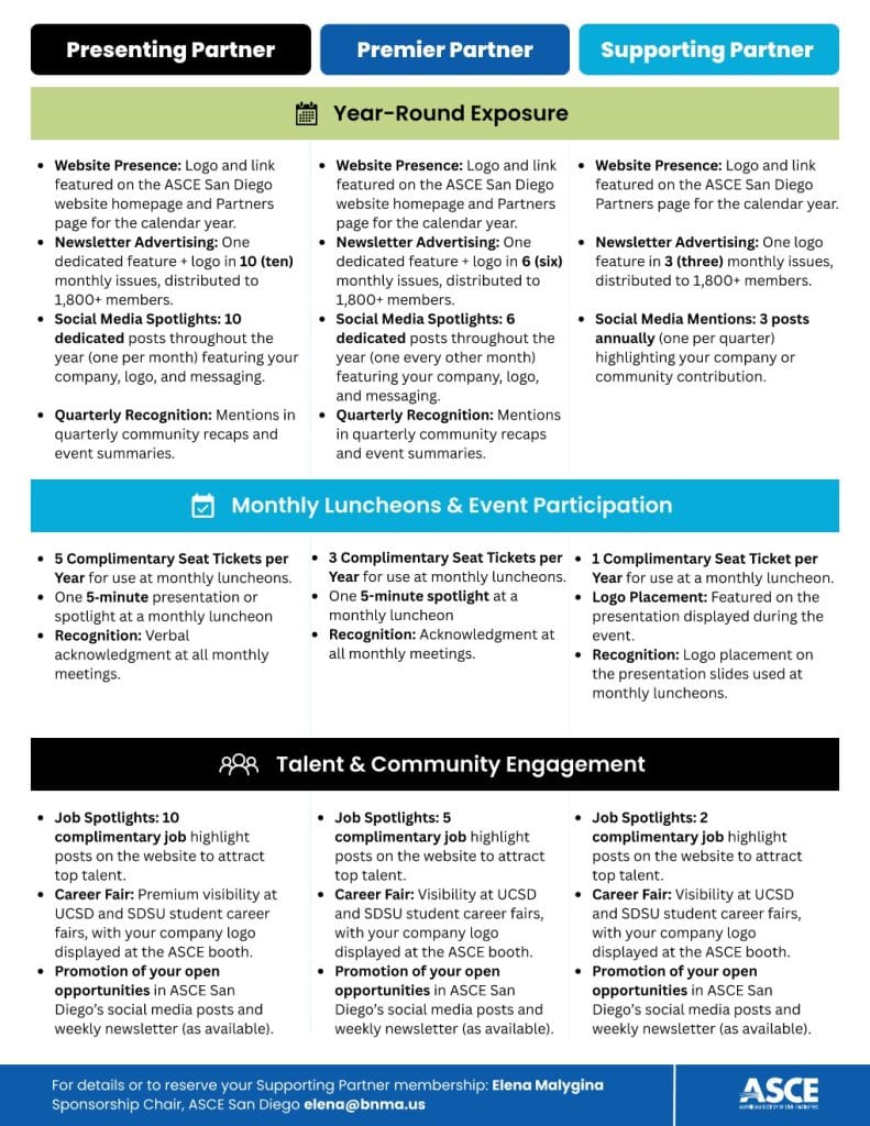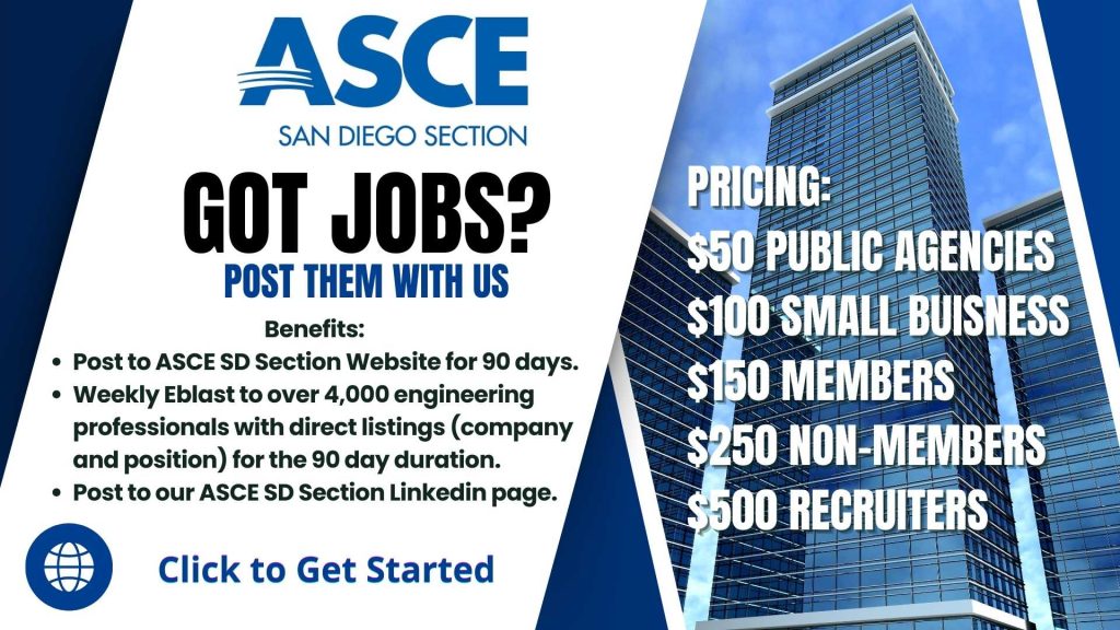 Today the San Diego Section represents more than 1,800 members of the Civil Engineering profession serving San Diego County and Imperial County. The San Diego Section includes three Technical Groups, two active Student Chapters, and a Young Members Chapter.