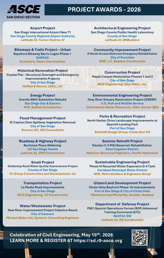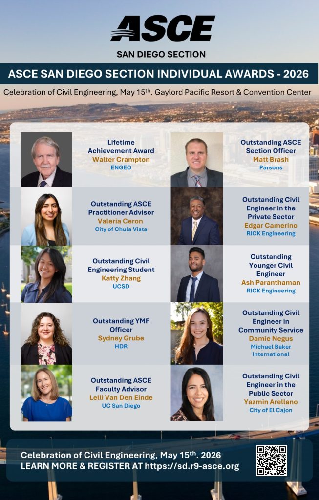 Today the San Diego Section represents more than 1,800 members of the Civil Engineering profession serving San Diego County and Imperial County. The San Diego Section includes three Technical Groups, two active Student Chapters, and a Young Members Chapter.